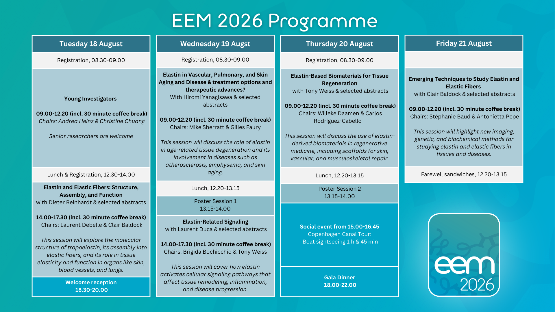 This session will explore the molecular structure of tropoelastin, its assembly into elastic fibers, and its role in tissue elasticity and function in organs like skin, blood vessels, and lungs.